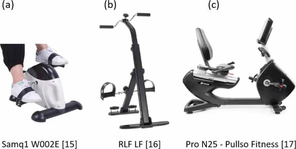 Regarding commercially available devices, there are some options oriented to rehabilitation, such as the mini bike with the possibility of pedaling hands and feet (Figure 3a) [15], and the device to exercise legs and arms (Figure 3b) [16], aimed at low-impact exercise for beginners and rehabilitation. Also available is the horizontal bike [17] for general use with 8 levels of magnetic resistance, with an LED display that can be connected to a cell phone via Bluetooth (Figure 3c).