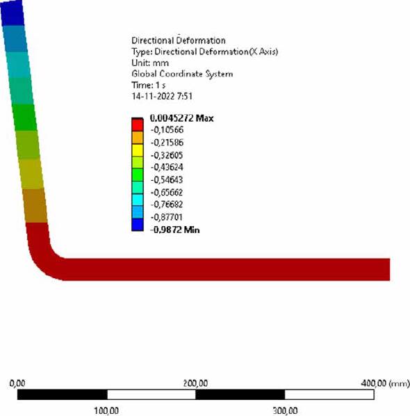 Regarding displacements that occur in the structure because of stresses, Figure 29 shows that the saddle support bar structure suffers a maximum displacement on its vertical line of 1.38 mm. This value is less than the quotient of the vertical length of the structure between 200 (Δ/200≤1.875 mm). Figure 30 shows the distribution of displacements in the back support bar structure, where the maximum value of the displacement is again less than the established limit.