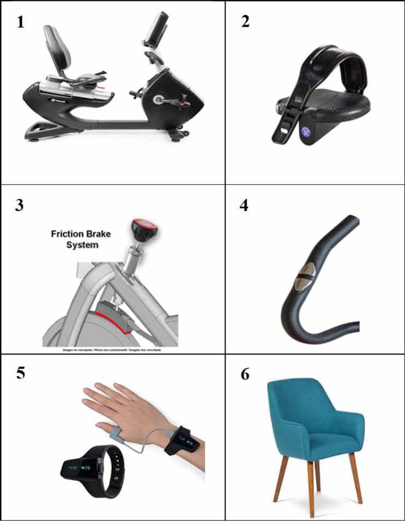 Concept 3 (Figure 6). This concept consists of a horizontal structure (1). However, unlike Concept 1, this one does not have a built-in saddle, so the user must use a chair available in the facility where they are located to perform the exercise (6). Foot adjustment is made from the widest part of the foot and is a rigid component (2). During exercise, resistance to pedaling is performed by a friction system regulated by a nongraded knob operated by the user (3). In addition, heart rate monitoring is performed by sensors built into the handlebars that are in front of the person (as on a common bicycle) (4), and measurement of respiratory rate and oxygen saturation is performed by two bracelets, one on each arm (5). Blood pressure is measured by an external blood pressure monitor, while the user is at rest. The device is easy to move as well since it has wheels.