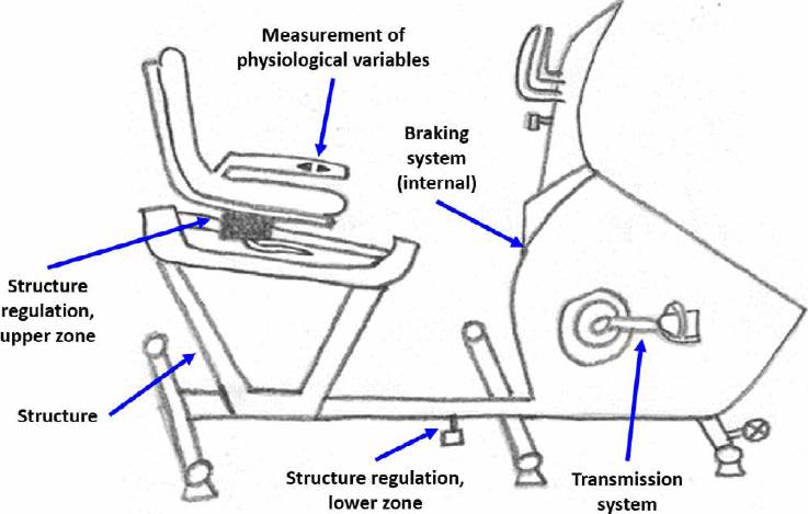 In addition, a pin was incorporated to separate the bicycle into two parts (making it modular), so that the user can use it in the way he/she feels most comfortable, complete, or just the front part. Also, the user can incorporate a seat of his/her preference, with the observation that in this case physiological variables cannot be measured. Although design scope did not contemplate implementation and programming of the sensors for physiological variables, general recommendations are given.