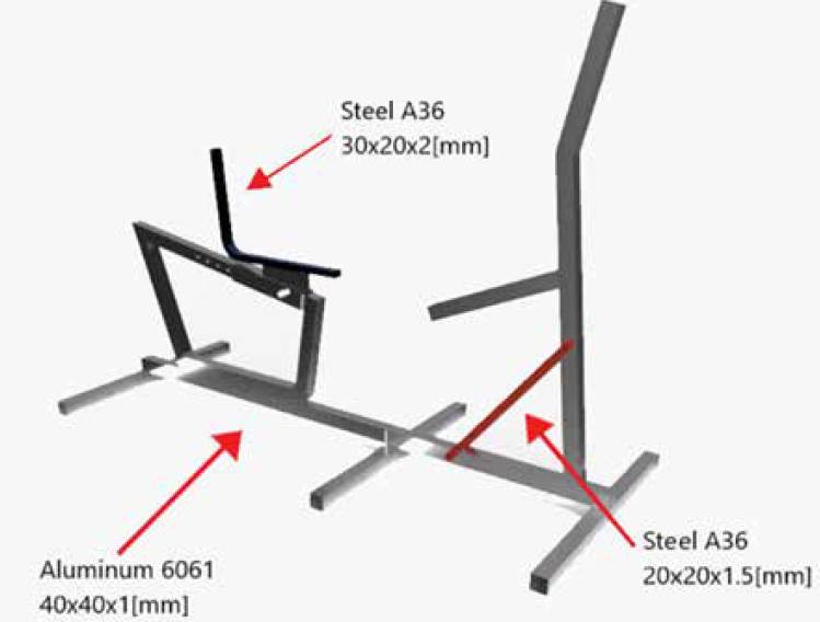 The structure is composed of elements that provide rigidity, stability, and support to the device. Three different sizes were considered for the rectangular profiles used according to the function that each one fulfills. Figure 8 shows the structure, where the two A36 steel profiles are shown, and the other profiles are made of 6061 aluminum. These materials were selected considering their structural use and wide availability in the national market, in different presentations and dimensions. Their suitability will also be verified through stress analysis.