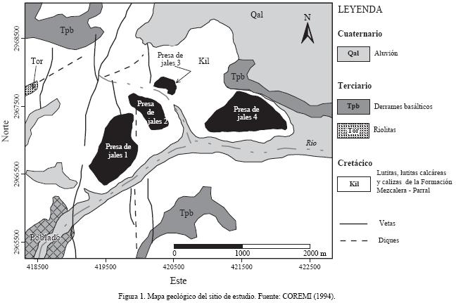 Las rocas sedimentarias del Cretácico pertenecen a la Formación MezcaleraParral (Kil), la cual está compuesta por una secuencia monótona de lutitas y lutitas calcáreas cuyo espesor conocido es del orden de 1,000 m. Se presentan intercalaciones de lentes de caliza de grano fino y margas. Esta unidad litológica constituye la roca encajonante de las vetas de PbCuZn que se explotan en el sitio de estudio (COREMI, 1994). Así mismo, la lutita de esta unidad litológica constituye la base de las presas de jales que se construyeron para el almacenamiento de los residuos mineros. Las rocas volcánicas son riolitas del Oligoceno (Tor), sobreyacidas por derrames de basaltos pliocénicos (Tpb) de edad posterior a la mineralización.