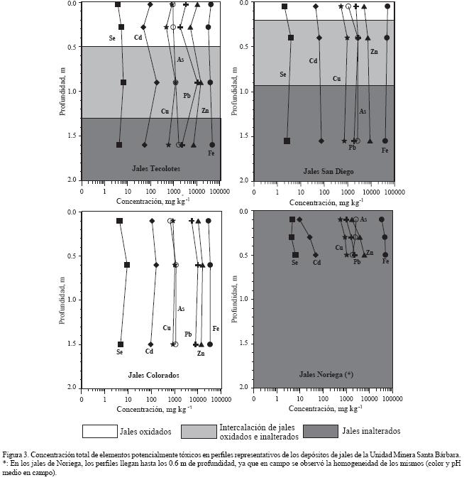Datos de perfiles representativos de los depósitos de los jales Tecolotes, San Diego, Colorados y Noriega se muestran en la Figura 3. En sentido vertical, las concentraciones totales de los EPT en los jales oxidados que están en la parte superior de los depósitos son similares a las registradas en los jales inalterados de las partes inferiores de los depósitos. Este es un comportamiento diferente al reportado en los jales generadores de drenaje ácido, donde las concentraciones de los elementos asociados a los sulfuros metálicos en la zona de jales oxidados son muy inferiores a las de la zona de jales inalterados como consecuencia del proceso de oxidación que produce la liberación y facilita el transporte y pérdida de los EPT en la zona de oxidación (Ljungberg and Ohlander, 2001; Romero et al., 2006).