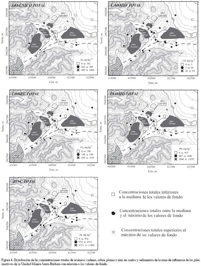 cm1. Los valores más altos de CE en los suelos de la zona de influencia podrían ser indicadores de su afectación por la dispersión de los jales, los cuales, en general, presentaron altos valores de CE (Tabla 4). La afectación de los suelos y sedimentos superficiales de la zona de influencia de los jales inactivos de Santa Bárbara se corrobora con el hecho de que en 15 muestras de suelos y sedimentos, de un total de 37, se registraron concentraciones totales superiores a la mediana de los valores de fondo para el As en la zona de estudio. En el caso del Cd, Pb, Cu y Zn se superó la mediana de los valores de fondo en 7, 22, 23 y 24 muestras, respectivamente (Figura 4).