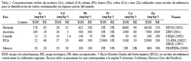 Sin embargo, es muy común que para la identificación de suelos contaminados se recurra a los denominados "niveles genéricos de referencia", los cuales han sido estimados con base en el riesgo ecológico y a la salud humana, asumiendo el 100% de disponibilidad de los contaminantes en los suelos evaluados. En México, la Procuraduría Federal de Protección al Ambiente estableció los niveles genéricos de referencia (PROFEPA, 2000) con base en los valores reportados en otros países. Estos niveles de referencia de PROFEPA (2000) caen dentro de los más estrictos (Tabla 1) y se aplican en forma general en todo el territorio nacional sin considerar que los suelos varían notablemente de un lugar a otro. La composición y el comportamiento químico del suelo están determinados por el tipo de roca del que se origina, el clima, la cubierta vegetal, el grado de intemperismo y la topografía, por lo que los niveles genéricos de referencia pueden ser inferiores o superiores a los valores de fondo naturales de los EPT en los suelos de México. Esto significa que su aplicación puede resultar en la subvaloración o sobrevaloración del problema ambiental que puedan representar los EPT en los suelos estudiados.