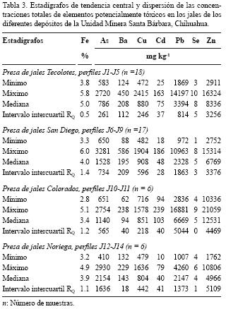 kg1). Las concentraciones totales de los otros elementos estudiados en los jales fueron relativamente bajas (Ba: 62 586 mg