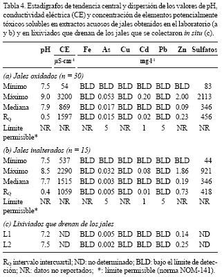 En las muestras de lixiviados que drenan de la presa de jales Noriega (Figura 1), los valores de pH son cercanos a la neutralidad (pH: 7.27.5), y las concentraciones de EPT solubles son muy bajas (Tabla 4) y similares a las registradas en los extractos acuosos obtenidos en el laboratorio en las muestras sólidas de jales. Estos resultados indican que los jales inactivos de la Unidad Minera Santa Bárbara no lixivian soluciones ácidas con elementos potencialmente tóxicos disueltos, y que la prueba de extracción utilizada es adecuada para valorar a los constituyentes tóxicos disponibles para la lixiviación.