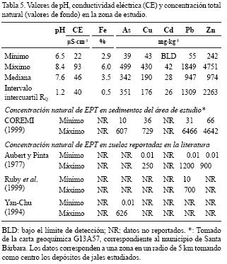 En los suelos utilizados para determinar los valores de fondo naturales se registraron valores de pH cercanos a la neutralidad (pH: 6.5 8.4) y los valores de conductividad eléctrica (22 93 µS cm1), en general, son más bajos que los determinados en los jales estudiados (Tabla 4). Estos datos conforman una evidencia de que esos suelos no han sido afectados por los desechos. Las concentraciones totales de los EPT evaluados que se presentan en la Tabla 5 (valores de fondo naturales) se encuentran dentro del intervalo de concentraciones naturales de EPT en sedimentos reportados en las carta geoquímicas G13A57 del Consejo de Recursos Minerales (COREMI, 1999) en un radio de 5 km tomando como centro las presas de jales estudiadas. Por otro lado, los valores de fondo naturales para el Zn, Pb, As y Cu en los suelos estudiados en este trabajo son comparables a los reportados en la literatura para suelos no contaminados. Aubert y Pinta (1977) reportaron que las concentraciones de Pb, Zn y Cu alcanzan valores máximos de 1,200 mg