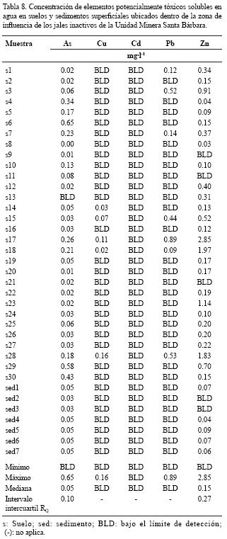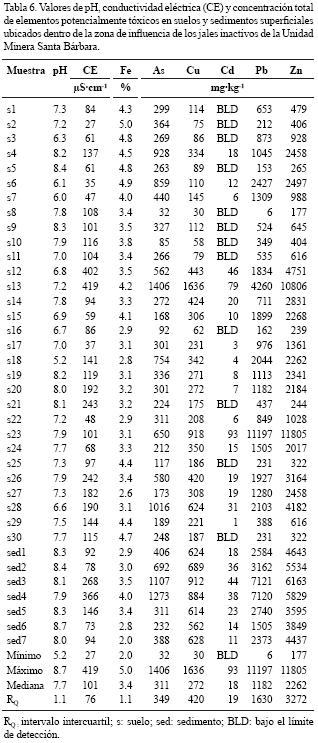 Los valores de pH, conductividad eléctrica y concentraciones totales de los EPT analizados en suelos y sedimentos superficiales (010 cm) de la zona de influencia de los jales inactivos de la Unidad Minera Santa Bárbara, se muestran en la Tabla 6. Los resultados indican que la mediana de los valores de pH en la zona de influencia (pH=7.7) es similar a la mediana de las muestras de fondo (pH=7.6) (Tabla 5) y a la mediana del pH en los jales de los diferentes depósitos (pH: 7.7 7.9) (Tabla 4), por lo que el pH no es un indicador de la afectación de los suelos y sedimentos por la dispersión de los jales. En cambio, los valores de conductividad eléctrica (CE) en los suelos de la zona de influencia varían entre 27 y 419 µS