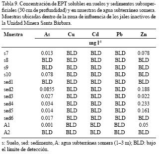 Estas concentraciones de EPT solubles son relativamente bajas e indican que los EPT están asociados a fases sólidas estables bajo las condiciones actuales del medio, lo que explica el hecho de que la afectación de los suelos de la zona de influencia ha sido superficial y los EPT no han migrado a niveles inferiores. Además, sugieren que las concentraciones totales de EPT encontradas a 30 cm de profundidad en algunas muestras de sedimentos se puede deber al transporte en forma de partículas muy finas, ya que de acuerdo con el método para determinar las concentraciones de elementos solubles, una vez que se agita la mezcla, ésta se filtra con membrana de 0.45 µm, de tal manera que la "concentración de elementos solubles" implica especies solubles y partículas inferiores a 0.45 µm.