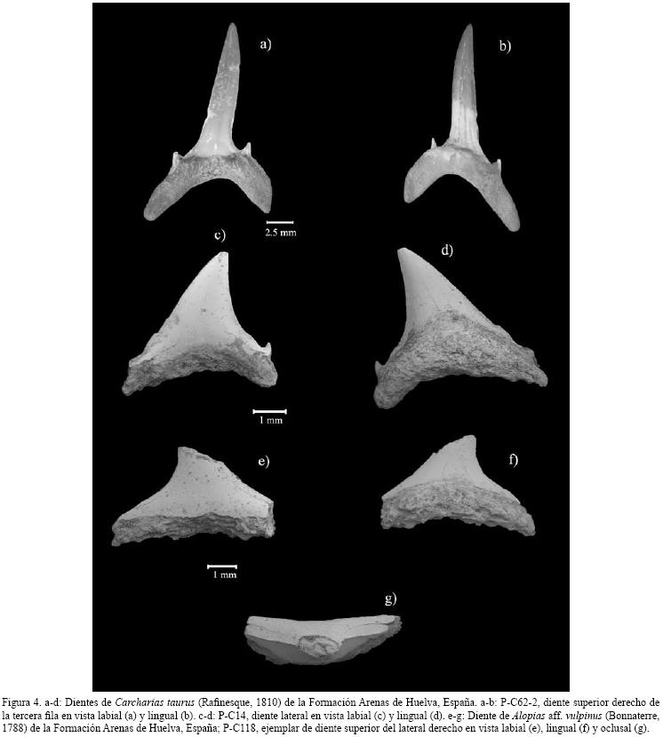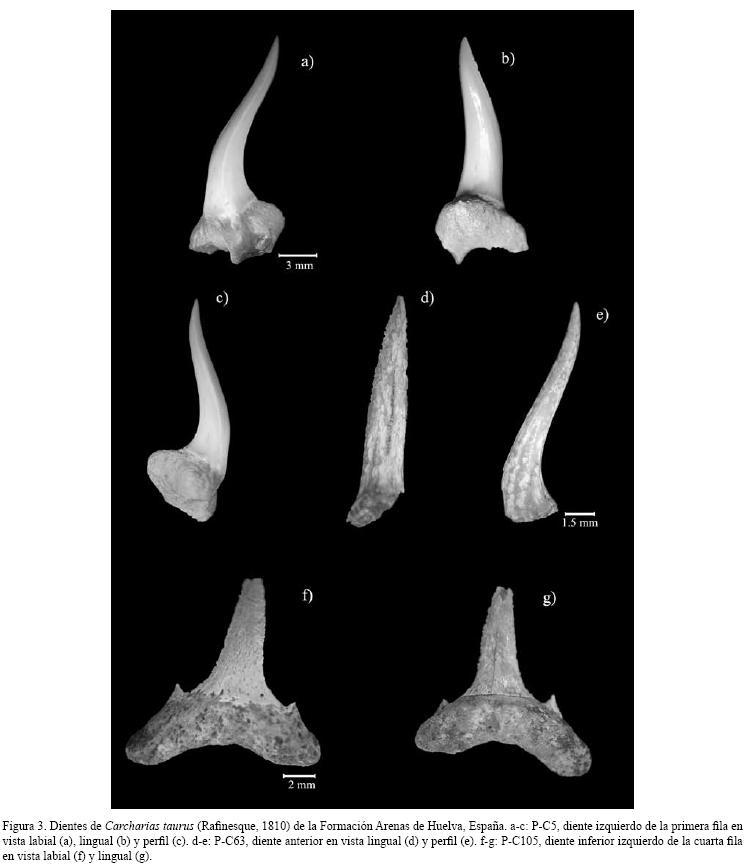 Se compararon con dientes fósiles de C. taurus del Plioceno de Angola, de la colección de paleontología de la Academia de Ciencias de Lisboa, determinados por Antunes (1978). Además se compararon con dientes fósiles de Carcharias acutissima de Esbarrondadoiro y Vale de Zebro (Mioceno terminal de la Cuenca de Alvalade, Portugal), de la Colección de Paleontología de la Universidad de Evora, descritos y determinados por Balbino (1995).