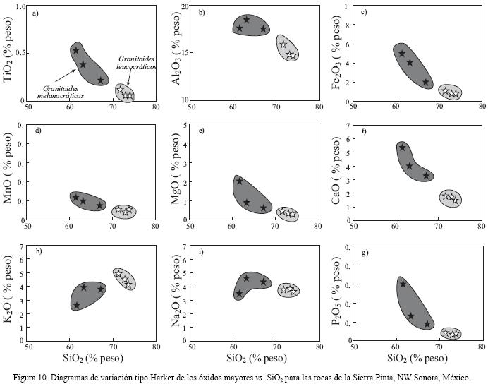 En la Figura 10 se muestran diagramas de variación de tipo Harker de los óxidos mayores vs. SiO2 en donde se pueden distinguir los dos grupos de granitoides. Claramente, los granitoides melanocráticos se agrupan separados de los granitoides leucocráticos. Para el caso de los granitoides melanocráticos, el contenido de SiO2 varía de un 61.6 a un 67.1 % en peso, mientras que para los granitoides leucocráticos los valores de sílice son más altos respecto a los anteriores (71.5–73.8 % en peso). Se pueden observar correlaciones negativas para TiO2, Al2O3, Fe2O3, MnO, MgO, CaO y P2O5 con respecto a SiO2 y un comportamiento positivo para K2O, mientras que el Na2O permanece constante para cada grupo de granitoides. Los datos para cada grupo de rocas definen tendencias lineares consistentes con la fraccionación de minerales del magma parental, es decir, los contenidos de la mayoría de los elementos, excepto K2O y Na2O, disminuyen progresivamente a medida que el contenido de SiO2 aumenta debido a la cristalización fraccionada. El K2O se comporta de manera incompatible (i.e., el líquido residual se enriquece en este elemento) definiendo una tendencia positiva en el gráfico h de la Figura 10. Como se había mencionado antes, este comportamiento se atribuye al efecto de contaminación cortical en márgenes continentales activos.