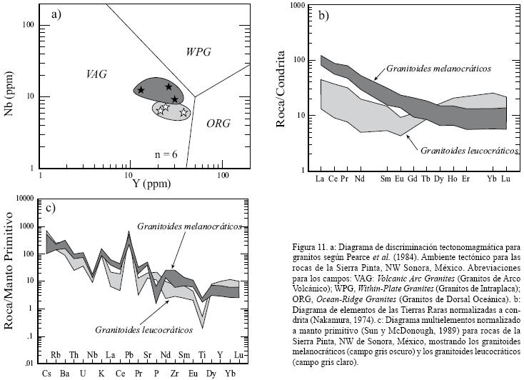 De acuerdo con el diagrama de discriminación tectonomagmática para granitos según Pearce et al. (1984), todos los granitoides de la Sierra Pinta caen en el campo de granitos de arco volcánico (Figura 11a).