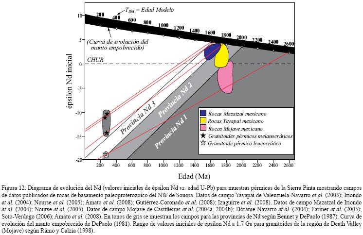 Para las muestras de granitoides pérmicos melanocráticos (PIN–07–1, PIN–07–4 y PIN–07–10) se obtuvieron valores iniciales de épsilon Nd entre –10.4 y –14.5 con correspondientes edades modelo Nd (TDM) entre 1.6 y 1.7 Ga (Tabla A6). Una cuarta muestra de leucogranito pérmico (PIN–07–2) presenta un valor inicial de épsilon Nd más negativo de –19.2 con correspondiente edad modelo Nd (TDM) de 2.6 Ga. Estos resultados isotópicos Sm–Nd son ilustrados en un diagrama de evolución del Nd donde se grafican los valores iniciales de épsilon Nd contra la edad U–Pb en zircones de cada roca (Figura 12). También se muestran las provincias de Nd definidas por Bennett y DePaolo (1987), los cuales dividieron espacialmente al basamento paleoproterozoico del SW de los Estados Unidos en tres diferentes provincias isotópicas de Nd que llaman: Provincia Nd 1 (Mojave), Nd 2 (Yavapai) y Nd 3 (Mazatzal) (Figura 1). Igualmente se reportan, en campos coloreados, los datos isotópicos Sm–Nd de rocas de basamento paleoproterozoico del NW de Sonora compilados de la literatura (Valenzuela–Navarro et al., 2003; Iriondo et al., 2004; Castiñeiras et al., 2004a, 2004b; Dórame–Navarro et al., 2004; Farmer et al., 2005; Nourse et al., 2005; Soto–Verdugo, 2006; Amato et al., 2008; Gutiérrez–Coronado et al., 2008; Izaguirre et al., 2008; Arvizu et al., en prensa). Las líneas de evolución de Nd de los granitoides melanocráticos pasan por el campo de las rocas Yavapai y Mazatzal, mientras que el granitoide leucocrático tiene una línea de evolución parecida a las rocas del Mojave mexicano. Esto podría implicar una evolución magmática independiente de los dos grupos de granitoides.