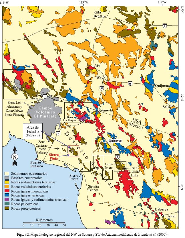 La Sierra Pinta se localiza en la porción NW del Estado de Sonora, dentro del municipio de Puerto Peñasco (Figuras 2 y 3). El trabajo geológico más importante realizado en la Sierra Pinta fue el publicado por Araux–Sánchez (2000), el cual presenta un estudio de cartografía geológica para obtener el contexto de la mineralización aurífera presente en la zona. Además, el Servicio Geológico Mexicano (SGM, 2002) realizó estudios en el área como parte de la elaboración de la Carta Geológico–Minera Puerto Peñasco H12–1, escala 1:250,000. Araux–Sánchez (2000) diferenció las unidades litológicas que a continuación se describen para el área basándose en las relaciones de campo, en extrapolaciones regionales, correlación litológica y edades isotópicas de U–Pb de rocas de regiones aledañas. El estudio petrográfico de las rocas y una descripción más detallada de las unidades litológicas de la Sierra Pinta se encuentran en Arvizu–Gutiérrez (2008).