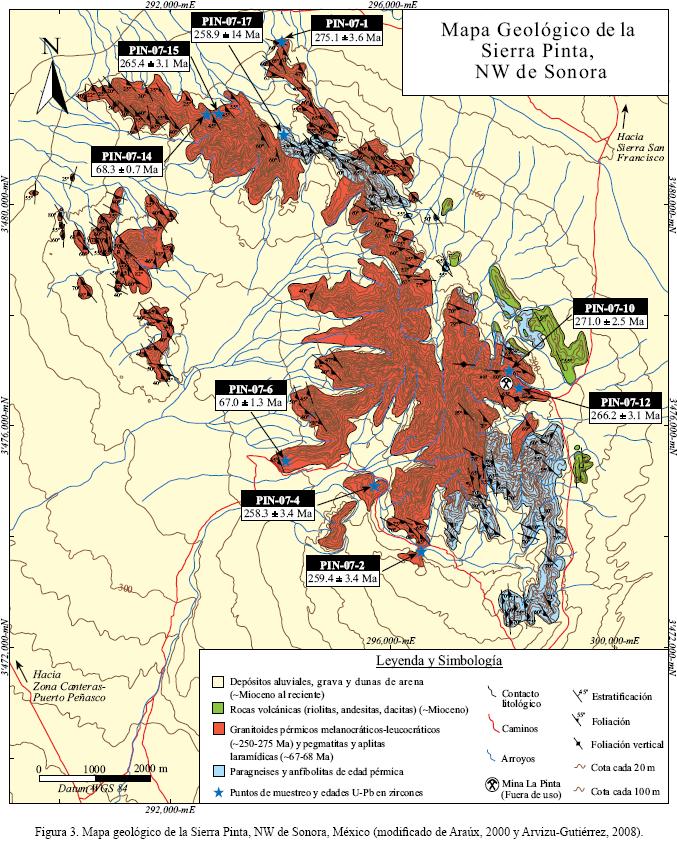 Cabe destacar que antes de que se realizara este descubrimiento de magmatismo pérmico en la Sierra Pinta en el NW de Sonora, las fuentes de zircones detríticos más cercanas se encontraban en el NE de México, en donde existen rocas plutónicas de esas edades implicando una gran complejidad para explicar el transporte de dichos detritos y dificultando notablemente las reconstrucciones paleogeográficas post–pérmicas del NW de México (Dickinson y Lawton, 2001).