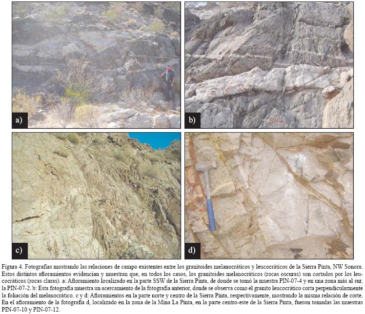 La unidad litológica con mayor afloramiento en la Sierra Pinta corresponde a un conjunto de granitoides pérmicos (Figura 3), unidad granítica cartografiada anteriormente como del Paleoceno por Araux–Sánchez (2000) y SGM (2002). La relación estratigráfica que tiene esta unidad granítica con la unidad de paragneises y anfibolitas es de tipo intrusivo. Los granitoides intruyen paralelamente a la foliación de las rocas metamórficas y, en ocasiones, cortan perpendicularmente a ésta. Debido a la variedad litológica de los granitoides, se diferenciaron dos facies principales. Una corresponde a un grupo de granitoides melanocráticos y la otra a un grupo de granitoides leucocráticos. Estos grupos se encuentran distribuidos al azar dentro de la Sierra Pinta, sin ninguna distribución preferencial aparente. La relación de campo indica que los granitoides melanocráticos son claramente intruidos por los leucocráticos (Figura 4) como lo describe Arvizu–Gutiérrez (2008).