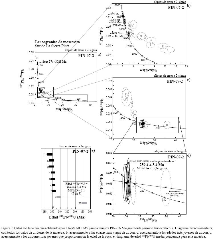 Un monzogranito de dos micas fue recolectado cerca de la Mina La Pinta, al oeste de la Sierra Pinta (Figura 3). El gráfico de concordia Tera–Wasserburg de la Figura 6d indica que existe una línea de discordia con intersección superior a los 1485 ± 39 Ma y una intersección inferior a 267.2 ± 2.9 Ma. Esta edad de intersección inferior es igual, dentro de los límites de error, a la edad 206Pb/238U media ponderada calculada a 271.0 ± 2.5 Ma (2–sigma; MSWD = 0.87) para un grupo coherente de 17 análisis de zircón (Tabla A2 y Figura 6f) representados por elipses con cuadros negros (Figura 6e). Esta edad 206Pb/238U se asigna a la cristalización del monzogranito de dos micas de la Mina La Pinta.