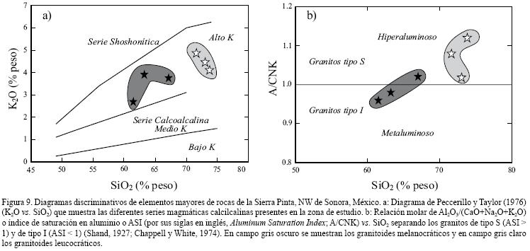 Las rocas pérmicas de la Sierra Pinta tienen composiciones típicas de granitoides. Con base en el diagrama de Peccerillo y Taylor (1976; K2O vs. SiO2) mostrado en la Figura 9a se determinó que todas las muestras analizadas caen dentro del campo calcialcalino con alto potasio. Esta característica pudiera reflejar el incremento del grado de contaminación cortical en márgenes continentales activos (Wilson, 1989).