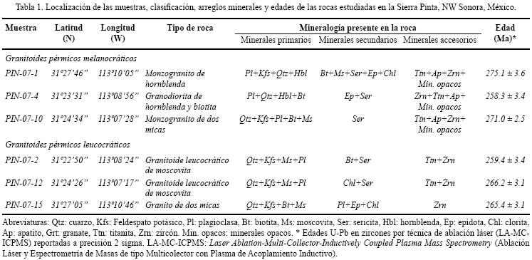 Key words: granitic rocks, U–Pb geochronology, zircon, geochemistry, Sm–Nd isotopic studies, Permian, Sierra Pinta, Sonora, Mexico.