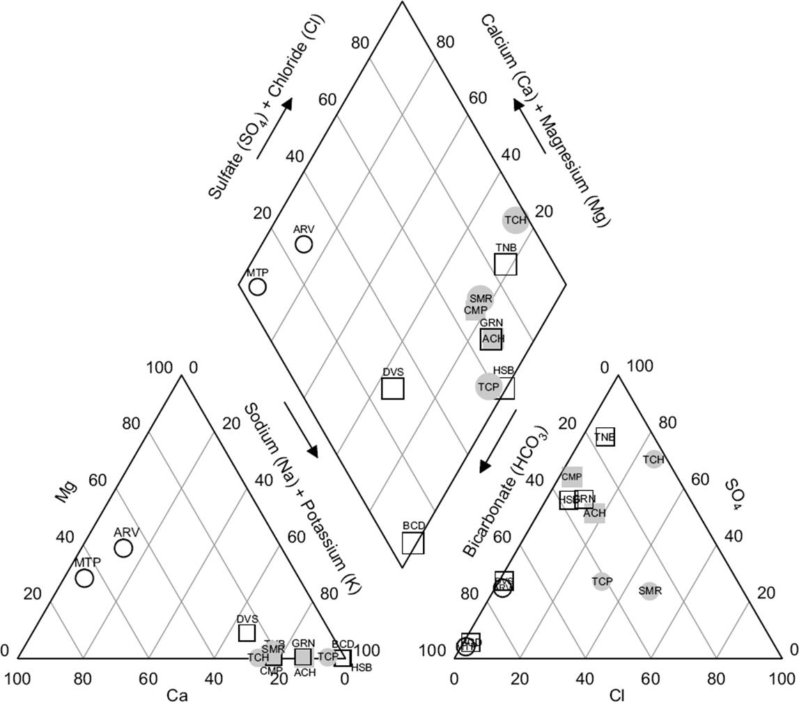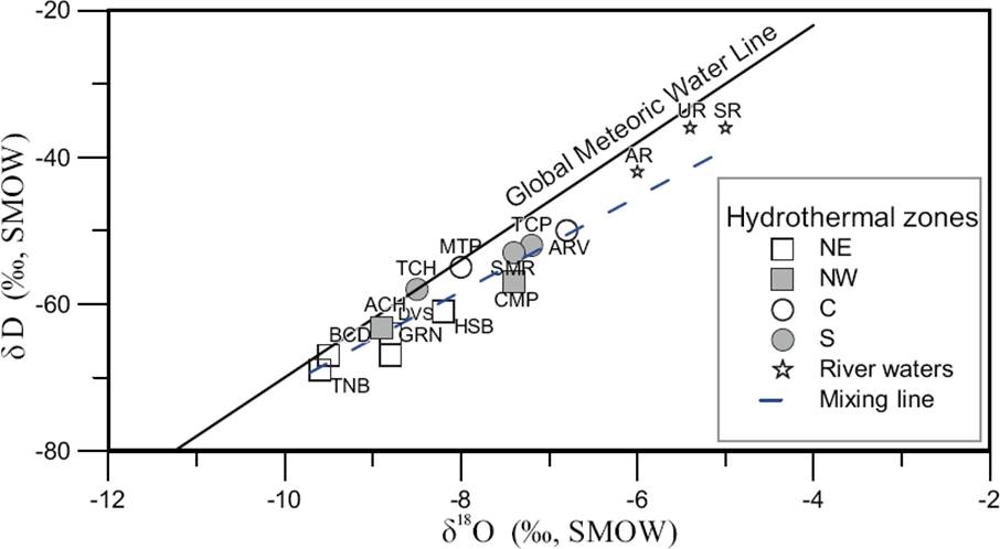 The interpretation of hydrogeochemistry classification diagrams mostly indicated the presence of sodium-sulphate (Na-SO4) waters in the North (NW: ACH and CMP; and NE: GRN and TNB) and South (TCP, SMP and TCH) hydrothermal zones; whereas calcium and magnesium-bicarbonate (Ca-Mg-HCO3) waters were found for the Central zone (MTP and ARV). Two hot spring waters located in the NE (BCD, HSB and DVS) zone were characterized as sodium-bicarbonate (Na-HCO3) type waters. The signatures of stable isotopes (δ18O and δD) indicate a meteoric origin for four hot spring waters (NE: BCD and TNB; S: TCH; and C: MTP), which lie near to the global meteoric water line; whereas a small shift for both isotopes was observed in the rest of the samples (NW: ACH and CMP; NE: HSB, GRN and DVS; C: ARV; and S: TCP and SMR). This small δ18O shift typified a mixing line which was used as a proxy to discriminate waters with a different isotopic signature.