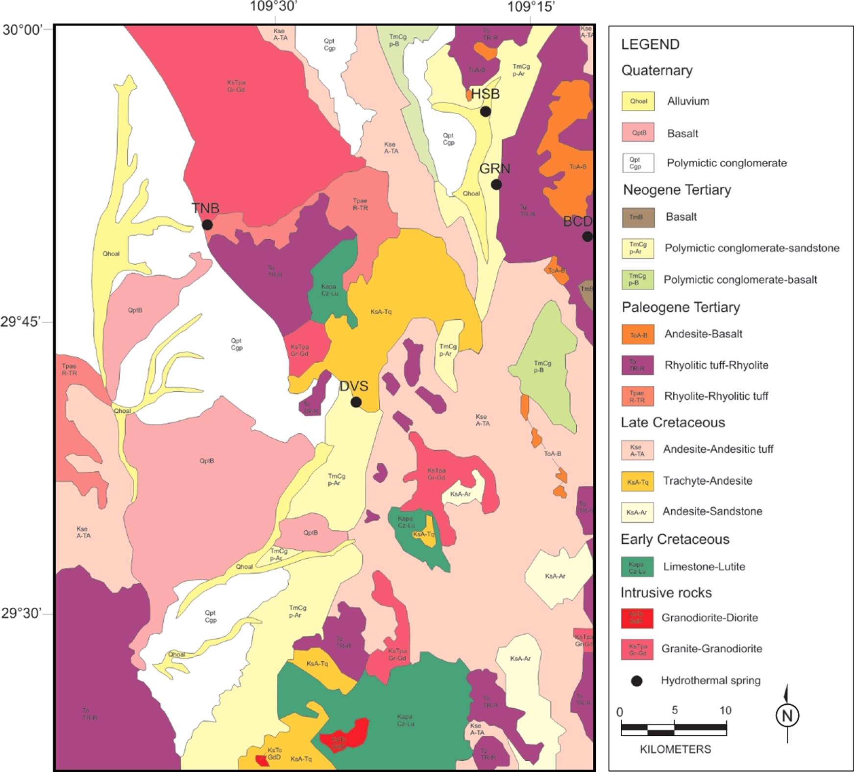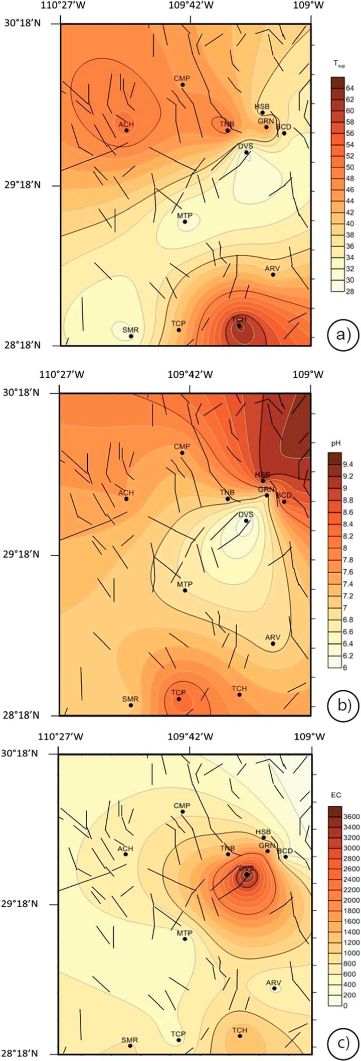 Torres et al. (1993) reported the existence of thermal springs of Na-HCO3 waters, which are associated with NNW-SSE regional structures in eastern Sonora. Using a comprehensive database, Iglesias et al. (2011) reported the existence up to 154 hydrothermal springs located in Sonora with surface temperatures ranging from 28 to 88 °C.