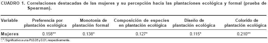 El Cuadro 1 muestra las correlaciones positivas con significancia estadística entre las mujeres y varios aspectos de ambas plantaciones (las correlaciones de los hombres fueron lo opuesto y no se muestran). A través de las correlaciones es posible hablar de tendencias de preferencia. De acuerdo a ello, se mostró que las mujeres tienden a preferir la plantación ecológica (P=0.002), además de que vieron a la plantación formal como "monótona" (P = 0.017), y a considerar atractiva la composición de especies de plantas (P = 0.028), el diseño (P = 0.046) y color (P = 0.002) de la plantación ecológica.