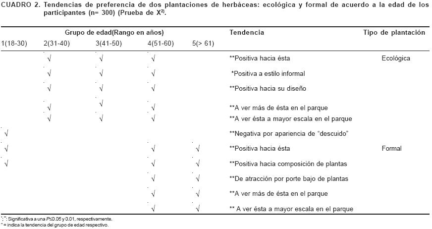 Por otra parte, las asociaciones estadísticamente significativas respecto a la edad y la plantación formal se comportaron de manera diferente que el anterior: hubo una preferencia por este estilo de plantación por el grupo de los jóvenes (1830) y los mayores a 50 años. Se mostraron positivos hacia esta plantación (P= 0.002), así como a la composición de plantas (P = 0.008), su bajo porte (P=0.008), además que se mostraron positivos hacia el estilo formal en el parque (P = 0.005) y en mayor escala (P = 0.003).