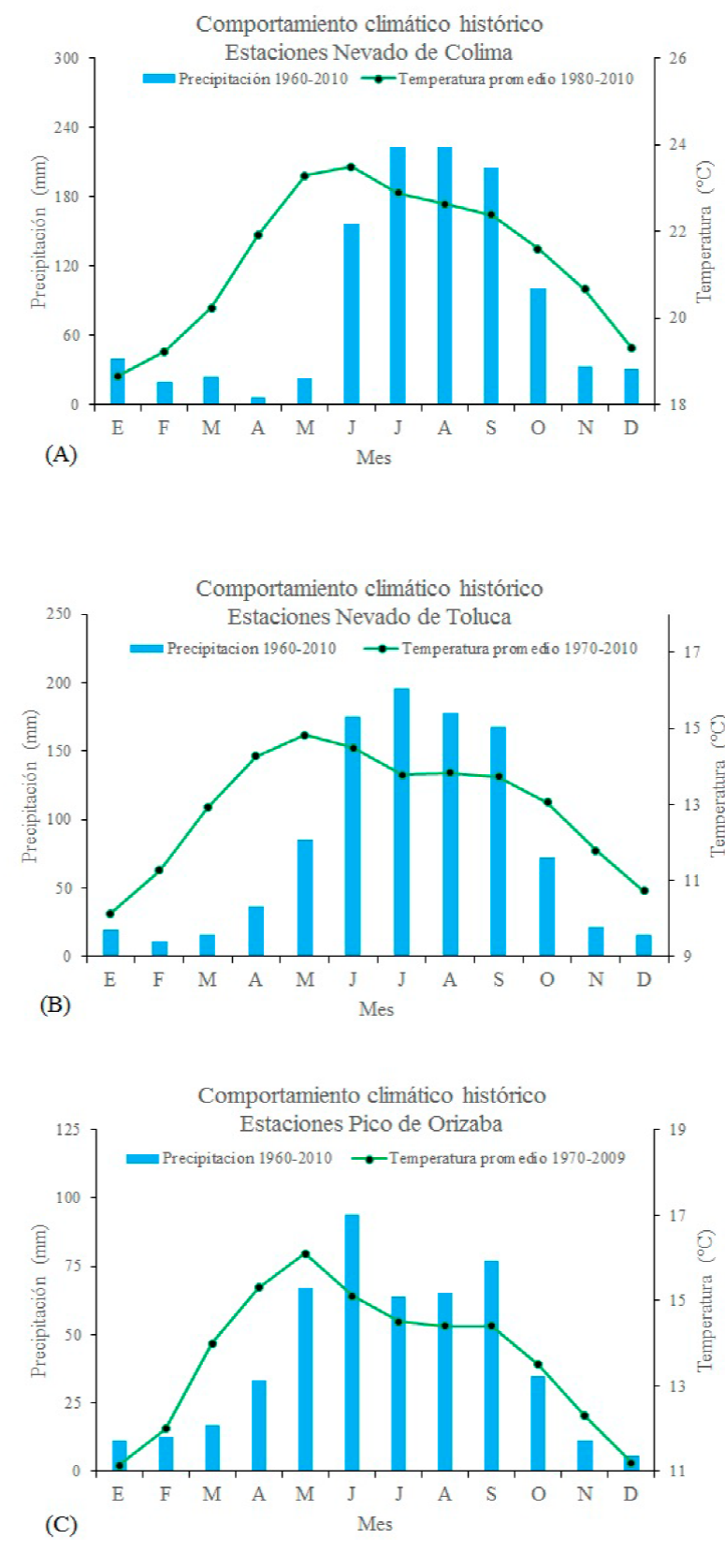 Figura 2 Tendencias de la precipitación y la temperatura promedio mensual históricas de las estaciones meteorológicas cercanas al Nevado de Colima (A), Nevado de Toluca (B) y Pico de Orizaba (C) de la Faja Volcánica Transmexicana.