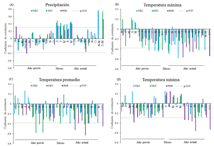 Figura 4 Coeficientes de correlación de la cronología residual y los registros climáticos en los sitios NEC (Nevado de Colima), NET (Nevado de Toluca) y POR (Pico de Orizaba) de la Faja Volcánica Transmexicana.