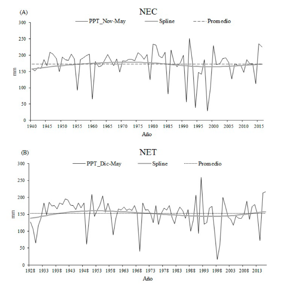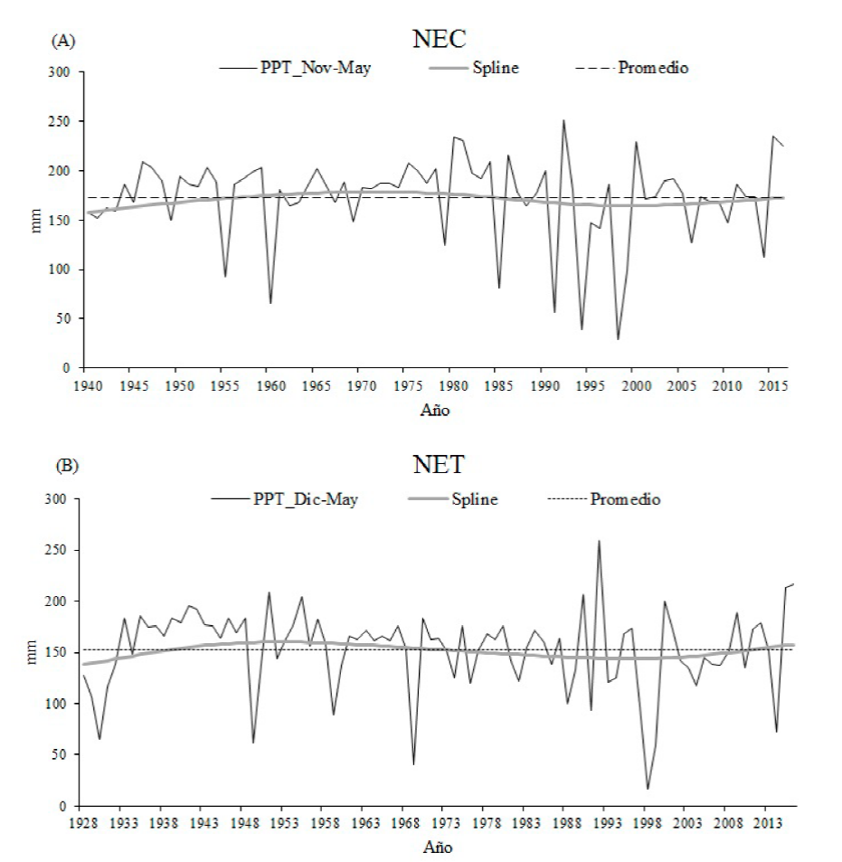 De acuerdo con el análisis de la relación clima-crecimiento radial, se reconstruyó la precipitación estacional de noviembre del año previo a mayo del año actual en el sitio NEC y la precipitación de diciembre del año previo a mayo del año actual en el sitio NET, mediante la aplicación de modelos de regresión lineal.