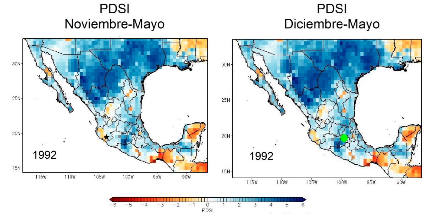 Los eventos de sequías extraordinarias registrados en 1930, 1949, 1955, 1959, 1960, 1991, 1998 y 1999 coinciden con los mencionados por Cerano-Paredes et al. (2013), Stahle et al. (2016) y Villanueva-Díaz et al. (2015; 2018b) para la Faja Volcánica Transmexicana, donde 1998 fue el año más seco registrado a nivel nacional. Los años secos de 1998 y 1999 se catalogan entre los más secos de las últimas siete décadas para el norte y centro de México, incidiendo en 60% del país (Domínguez, 2016). Simultáneamente, los años secos de 1955 y 1998-1999 coinciden con la ciclicidad de sequías registradas para América del Norte de cada 50 años a 60 años (Stahle et al., 2016).