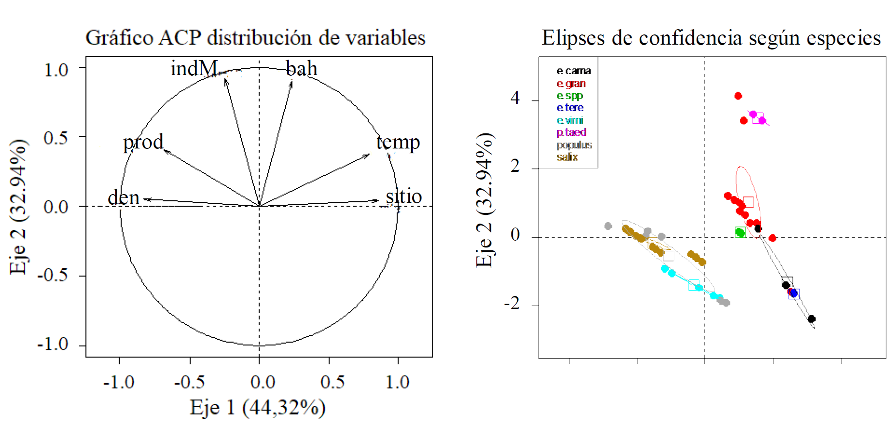 Un análisis de componentes principales (ACP) permitió establecer las relaciones entre productividad de biomasa del fuste, variables climáticas, ambientales y densidad de plantación. La productividad de biomasa de los clones 2136 y X78 fue comparada con datos de productividad de biomasa en Argentina recopilados y ya publicados (Fernández y Lupi, 2016). Los resultados fueron interpretados mediante las herramientas gráficas del ACP, estas permiten visualizar las correlaciones entre variables y la distribución de los individuos, ambos en los ejes principales del plano factorial. Los resultados de productividad de biomasa del fuste de los clones aquí estudiados fueron considerados variables cuantitativas suplementarias. Se eliminaron las variables altamente correlacionadas entre sí, por ejemplo, la precipitación y el balance hídrico (coeficiente de correlación 0,84, p<0,05). La representación de los elementos fila (índices relevados de productividad de biomasa de fuste) fueron agrupados según la especie. Las variables consideradas finalmente en el análisis de ACP fueron las siguientes (Tabla 1): productividad anual (prod), densidad de plantación (den), temperatura media anual (temp), índice de Martonne (precipitación media anual/temperatura media anual, indM), balance hídrico (precipitación - evapotranspiración potencial, bah), limitaciones de sitio (sitio).