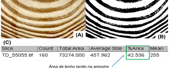 (A) Entrada da face do corpo de prova; (B) Processamento da imagem; e (C) resultado do cálculo da proporção de lenho tardio Fonte: Elaborado pelo autor.