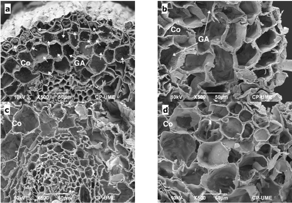 a) tratamiento testigo, b) sal sulfático-sódica, c) sal sulfática, d) sal clorhídrica. Co = Zona de corteza de la raíz, GA = gránulos de almidón (las flechas indican las zonas con presencia de gránulos de almidón).