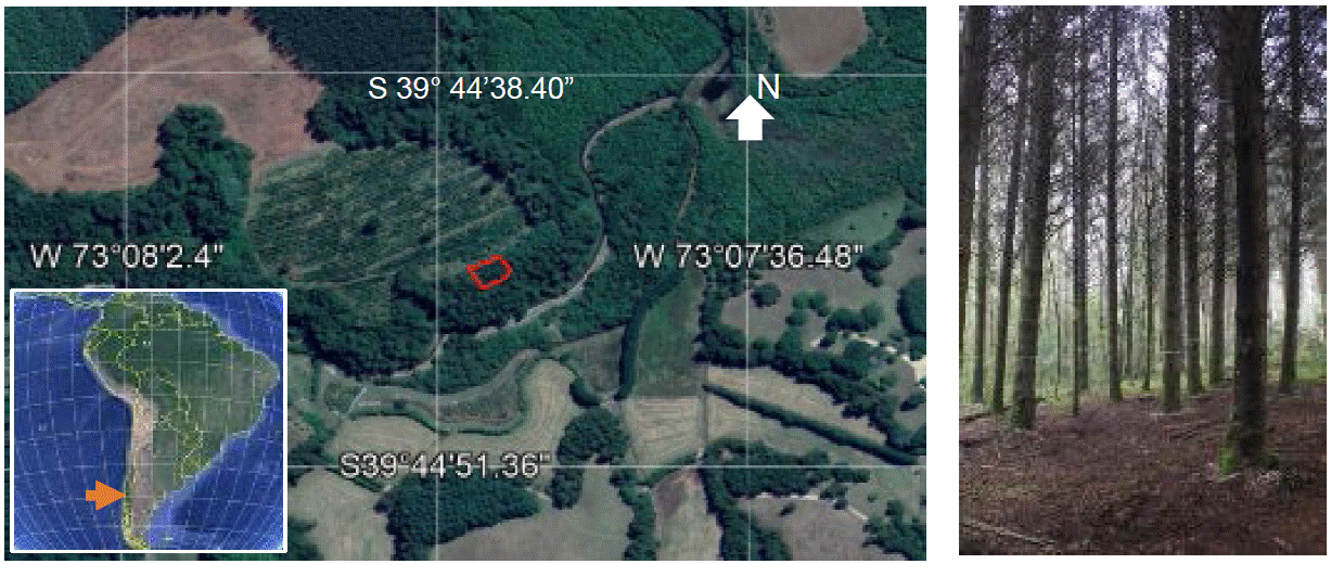 El rodal se ubicó en el predio Las Palmas del Centro Experimental Forestal de la Universidad Austral de Chile, en la latitud 39º44’45,12” S y longitud 73º07’48,4” W, a 19 m de altitud (Fig. 1). Fue establecido en 1976 con plantas cuya viverización fue de cinco años, producidas a partir de semillas de pinsapares de Yunquera y Tolox, España (Cardalliaguet et al., 2019), correspondientes a la región de procedencia Ronda-Sierra de las Nieves (Ministerio para la Transición Ecológica y el Reto Demográfico, 2023). El rodal tiene 0,033 ha, está formado por siete filas de 11 árboles y espaciamiento aproximado de 2 m × 2 m, con densidad inicial de 2310 árboles por hectárea, la que permitió calcular la supervivencia actual en el rodal considerando el censo de árboles. Limita al norte con el camino de acceso y con plantaciones de Pinus radiata D. Don, al sur con un bosque nativo secundario de Nothofagus obliqua (Mirb.) Oerst. y Nothofagus dombeyi (Mirb.) Oerst., al este con una plantación de Sequoia sempervirens (D. Don) Endl. y al oeste con una plantación de Pseudotsuga menziesii (Mirb.) Franco. Ambas plantaciones de los flancos también fueron establecidas en 1976. Todas las mediciones en el rodal se realizaron en agosto de 2018 (42 años de edad) y los análisis se realizaron en laboratorios de la Facultad de Ciencias Forestales y Recursos Naturales de la Universidad Austral de Chile en septiembre y octubre del mismo año.