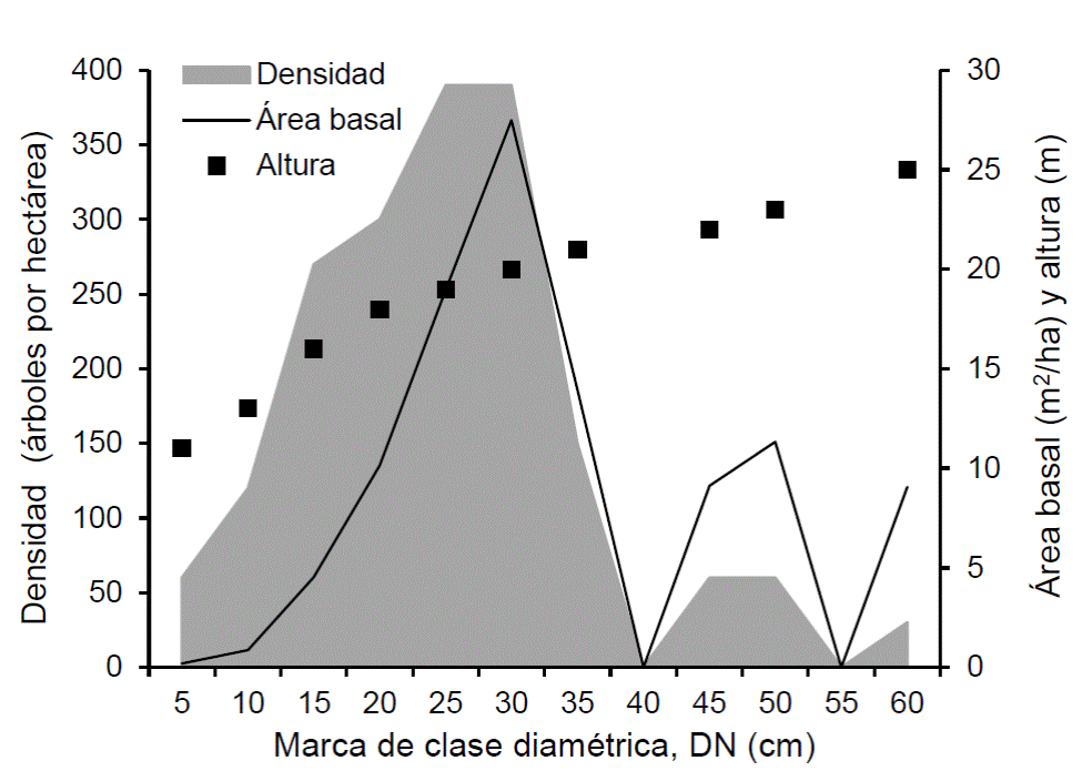 La densidad fue de 1830 árboles por hectárea, mostrando supervivencia de 79,2%, con DN promedio de 24,9 cm, DMC de 27 cm, área basal de 105,6 m2/ha y altura dominante de 22 m (Fig. 2). Las clases superiores de DN se encontraron junto al camino de acceso con marcado efecto de borde. Las clases diamétricas más pequeñas (DN < 20 cm) pertenecían a la clase sociológica de suprimidos. El rodal también presentó 60 árboles por hectárea y 1,06 m2/ha de área basal de individuos de N. obliqua establecidos por regeneración natural. Estos árboles fueron excluidos de la tabla rodal. También se encontraron árboles muertos en pie, todos con DN < 15 cm: 360 árboles por hectárea de A. pinsapo y 60 árboles por hectárea de N. obliqua.