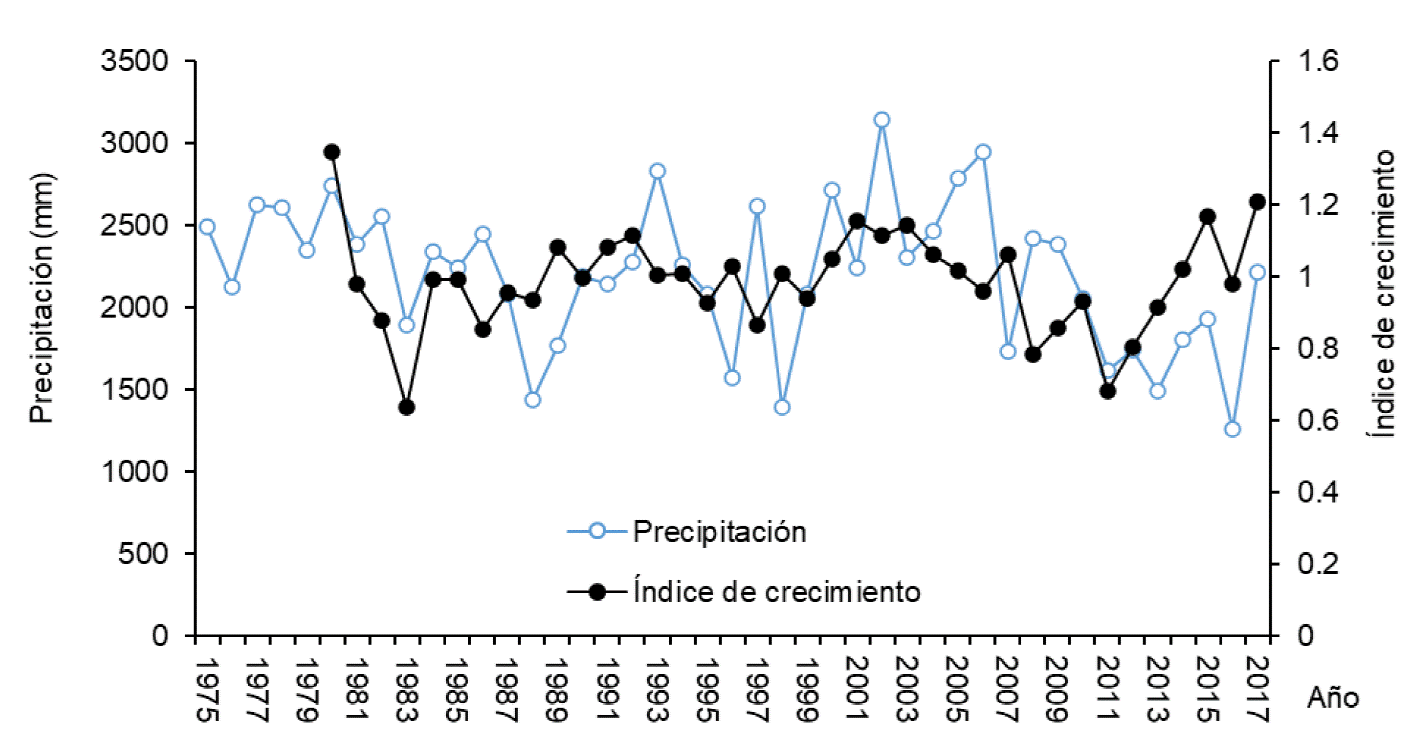 Durante el período de crecimiento (Fig. 4), la precipitación anual promedio fue de 2234 mm, con mínimo de 1260 mm y máximo de 3140 mm. Durante la competencia interespecífica inicial y en la etapa de competencia intraespecífica fuerte, se apreció una relación directa entre el índice de crecimiento y la precipitación, porque los árboles estarían sometidos a mayores grados de estrés. En el período intermedio no se observó una relación clara entre el crecimiento y la precipitación.