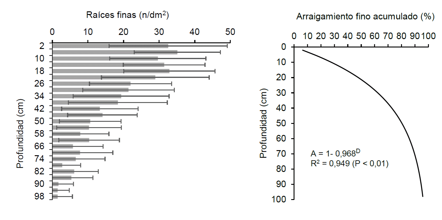 En el suelo se apreció arraigamiento fino profundo (Fig. 5), con más de 30 raíces por decímetro cuadrado hasta los 25 cm de profundidad y menos de 5 raíces por decímetro cuadrado a 1 m de profundidad. Del arraigamiento fino, 50% se encontró en los primeros 21 cm de profundidad y 75% se alcanzó a los 43 cm, demostrando un arraigamiento con alta concentración superficial caracterizada por un bajo valor del coeficiente β (0,968) del modelo de Gale y Grigal (1987).