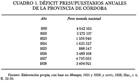 Las políticas de emisión de títulos lanzados al mercado (7 950 000 m$n en 1919 y 5 690 000 m$n en 1921) y que en su mayor parte fueron derivados para paliar el desfase presupuestario, poco efecto surtieron. Los déficit se sucedieron y persistieron en las cuentas de la provincia a lo largo de la década (véase cuadro 1).