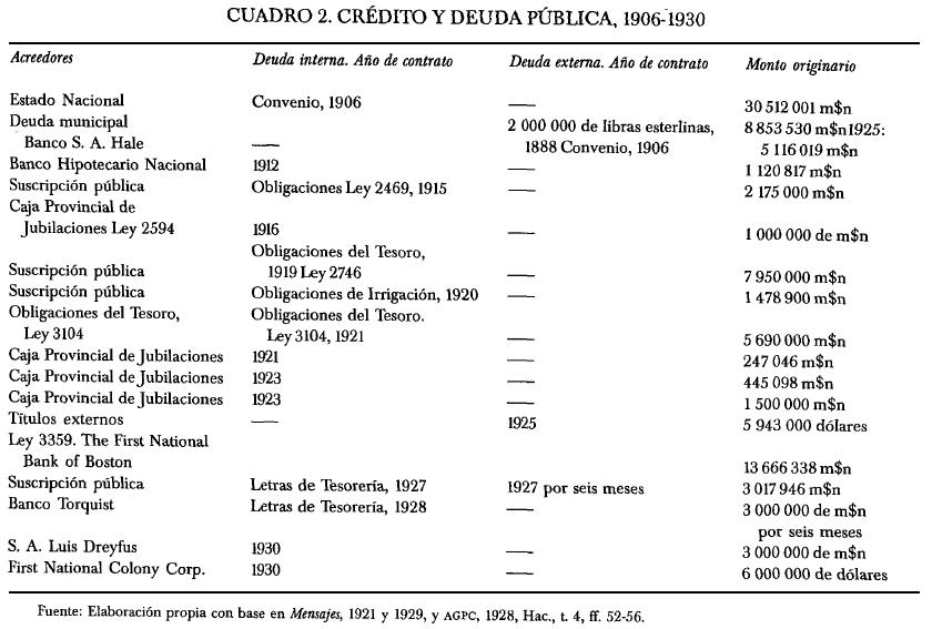 El incremento de la deuda consolidada no se hizo esperar. En un informe enviado al banquero Ernesto Tomsquist, la provincia reconocía en ese rubro la cantidad de 63 448 000 m$n, desagregados en deuda externa por un valor de 13 789 000 m$n y deuda interna estimada en la cantidad de 49 659 000 m$n, que incluía una obligación a favor del gobierno nacional por 28 412 000 m$n, al que también se adeudaban los servicios atrasados correspondientes al periodo 1915 a 1923.36