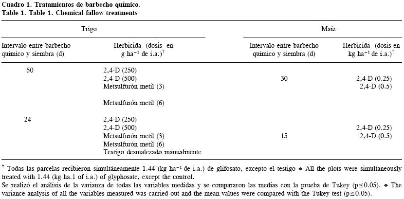 El diseño experimental fue parcelas divididas; la parcela principal fue la fecha del barbecho químico previo a la siembra: 50 y 24 d para el trigo y 30 y 15 d para el maíz. La sub–parcela correspondió a las combinaciones de dosis y herbicidas en el trigo y sólo dosis de herbicida en el maíz (Cuadro 1). Cada tratamiento se repitió tres veces. Se realizó el análisis de la varianza de las variables medidas y las medias se compararon con la prueba de Tukey (p<0.05). Los intervalos entre el barbecho químico previo a la siembra se usan habitualmente en estos sistemas y se eligió la dosis recomendada (la más baja en este trabajo) y el doble (por la frecuente superposición en la aplicación).