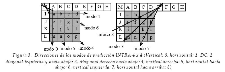 La figura 3 muestra la predicción de un bloque de luminancia de 4x4 muestras. [a, b, ..., p] son las muestras bajo predicción del bloque actual y [A, B, ..., M] las muestras del bloque previamente reconstruido. Las muestras se utilizan de acuerdo con las direcciones de predicción de cada modo, las flechas indican la dirección de predicción (ITU–T H.264, 2003).