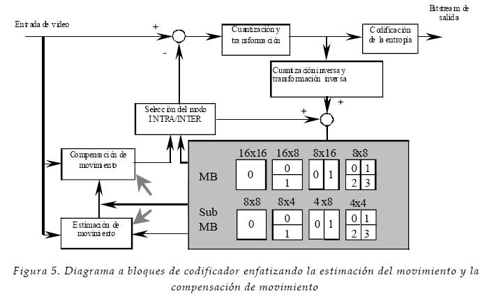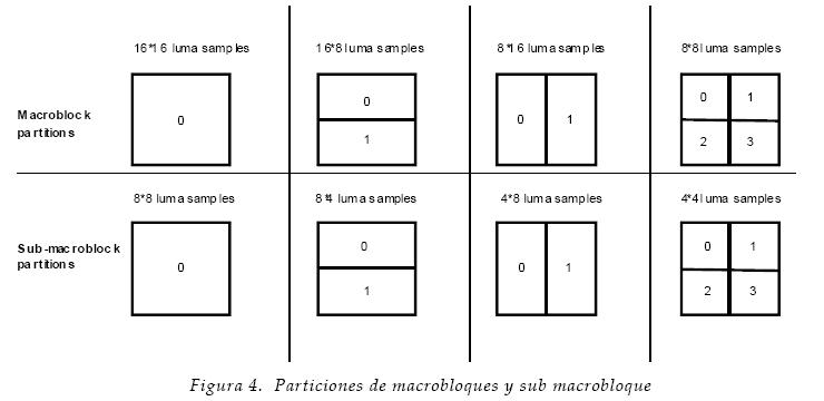 Un macrobloque de luminancia de 16x16 muestras, puede dividirse en pequeños bloques de hasta 4x4, como se muestra en la figura 4. Existen cuatro casos: 16x16, 16,8, 8x16 y 8x8 para los macrobloques de 16x16. También existen cuatro casos para un macrobloque de luminancia de 8x8: 8x8, 8x4, 4x8, 4x4. Entre más pequeño sea el bloque bajo predicción, mayor será el número de bits para representar los vectores de movimiento y otros datos tales como el tipo de partición; sin embargo, si se utilizan particiones pequeñas se puede reducir considerablemente el error o residuo resultante de la compensación de movimiento. La selección del tamaño de la partición depende de las características del video de entrada. En general, una partición grande es beneficiosa cuando las muestras del bloque son homogéneas y una partición pequeña cuando no existe homogeneidad (detalles) (Wien, 2003).
