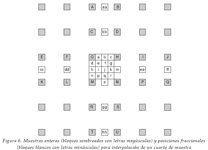 Similarmente, la muestra h se puede calcular de las muestras verticales A, C, G, M, R y T. Una vez calculadas las muestras con exactitud de 1/2 , se calculan las muestras con exactitud de 1/4 por medio de interpolación bilineal entre muestras de exactitud entera y de 1/2 . Por ejemplo, la muestra 'a', con exactitud de 1/4 de muestra, se puede calcular de la muestra entera G, la muestra 'b' con exactitud 1/2 , se calcula utilizando la ecuación 2.