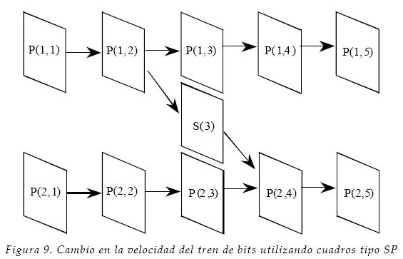 En el H.264 se utilizan rebanadas de video tipo SP y SI para cambiar el tren de bits (Ghanbari, 2003). La figura 9 muestra cómo utilizar los cuadros SP para cambiar entre diferentes trenes de bits. Suponiendo que existen dos trenes de bits, P(1,k) y P(2,k), correspondientes a la misma secuencia de video pero con diferentes velocidades binarias. Dentro del tren de bits codificado, los cuadros SP se colocan en una posición a la cual se permita un cambio de tren de bits.