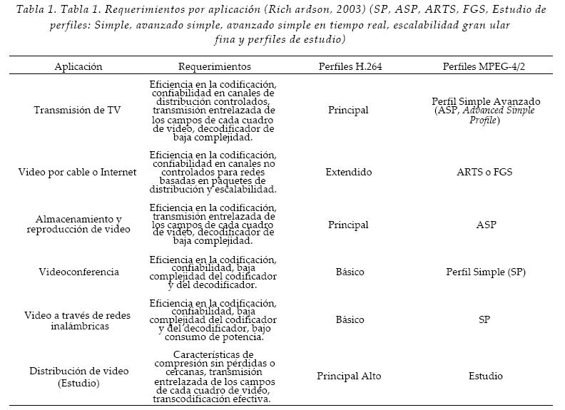 La tabla 1 lista a los perfiles del H.264 y del MPEG–4 parte 2 (video), así como los requerimientos más importantes para cada aplicación.