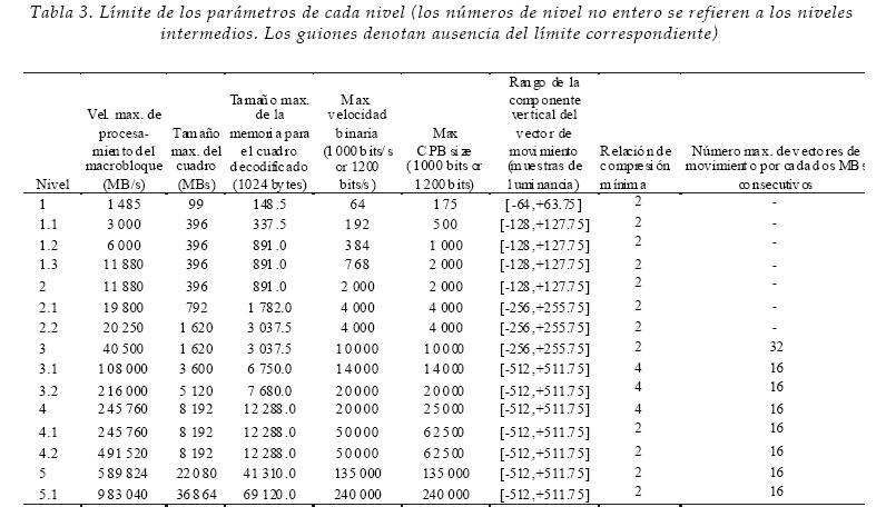 Los niveles de cada perfil se muestran en la tabla 2. Cada nivel soporta diferentes tamaños de los cuadros de entrada ( QCIF, CIF, ITU–R 601 (SDTV), HDTV, S–HDTV, Cinema digital (Richardson, 2003)). Cada nivel ajusta los límites de las velocidades binarias, tamaño de la memoria para almacenar cuadros de referencia, etc. La tabla 3 muestra los parámetros límite de cada nivel.