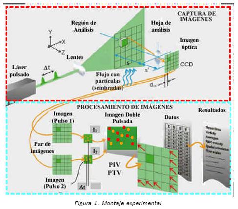 El sembrado de las partículas, se realizó en forma superficial y cerca de la zona de captura. Para la captura y análisis de las imágenes, se empleó el software de marca SharpproVision PIV, que es parte integral del sistema, además ayuda a la sincronía entre la cámara y la fuente láser. La técnica estadística de análisis empleada para el procesamiento de las imágenes, fue la de correlación cruzada. La figura 1 presenta el proceso de la técnica PIV.