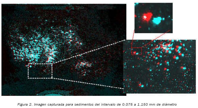 La captura del primer grupo de imágenes se realizó con frecuencia de pulso de luz láser de 2 ms. El conjunto de imágenes complementarias fue capturado con frecuencia de pulso de 5 y 10 ms y un promedio de 20 pares de imágenes por corrida con cinco repeticiones por grupo de sedimentos. Una vez capturadas, se realizó la combinación de las imágenes por pares, empleando el software Photo Shop Pro, considerando los canales RGB (Red, Green y Blue), con la finalidad de realizar el análisis por medio de correlación cruzada. En la figura 2, se muestra la combinación de dos imágenes capturadas en diferentes pulsos de luz, en esta combinación el canal rojo (R) corresponde a la imagen capturada en el primer pulso, el canal azul (B) corresponde a la imagen capturada en el segundo pulso. En este trabajo se consideró la misma imagen para los canales G y B, debido a que solamente se tiene la secuencia de dos imágenes. Sin embargo, si se cuenta con imágenes capturadas en pulsos sucesivos, cada canal (RGB) puede corresponder a una imagen distinta con periodos de pulso iguales o diferentes. En el análisis de las imágenes se aprecian claramente los pares de partículas; no obstante, por tratarse de un intervalo de tamaño de partículas, éstas presentan formas y tamaños diferentes.
